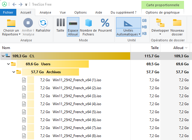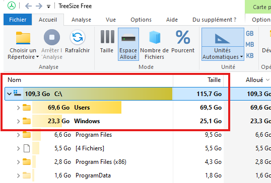 Et surtout, en surbrillance jaune les dossiers les + volumineux :