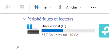 Un petit tour dans l’explorateur de fichiers pour visualiser l’état du disque dur, et tadaaaam. La capture d’écran parle d’elle même, le disque C: était complètement plein :